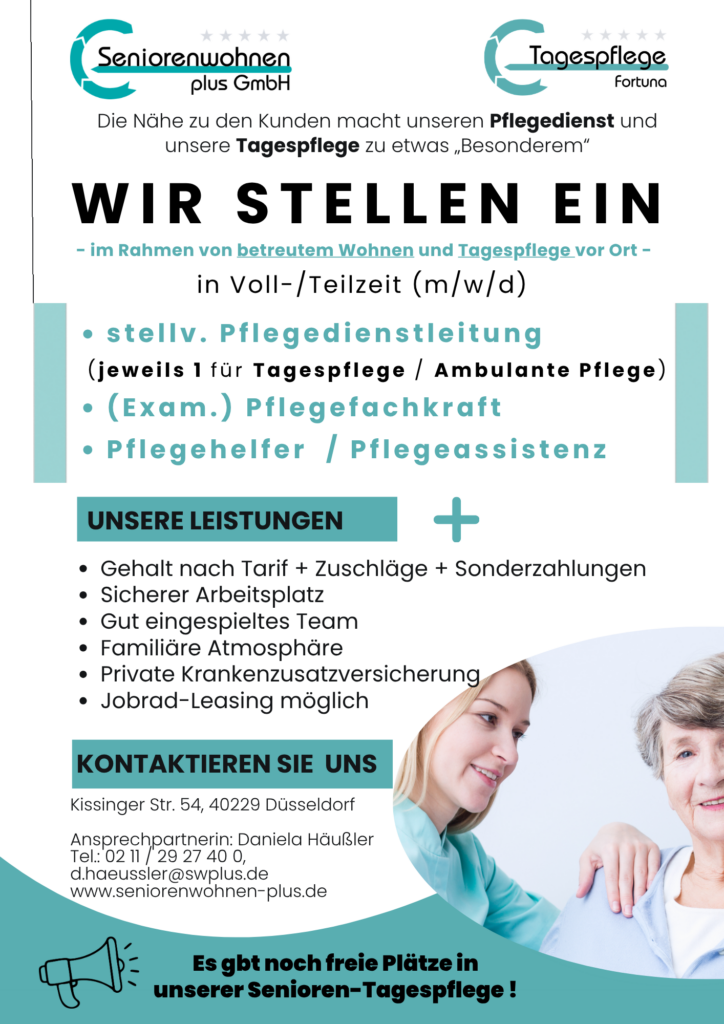 Wir suchen ab sofort für unser Betreutes Wohnen sowie unsere Senioren-Tagespflege in Düsseldorf-Eller jeweils